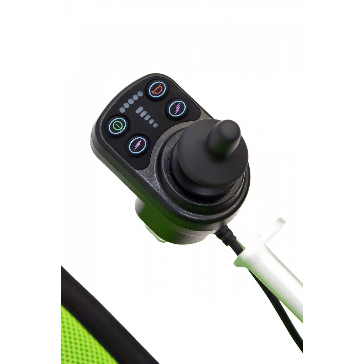 Управление интуитивно понятное: джойстик и все основные кнопки расположены на удобном пульте, который можно закрепить с любой стороны подлокотника. Пользователь сам выбирает комфортное расположение. Дополнительно предусмотрен съёмный фонарик с USB и Type-C разъёмами — практичное решение для поездок и повседневных задач.
