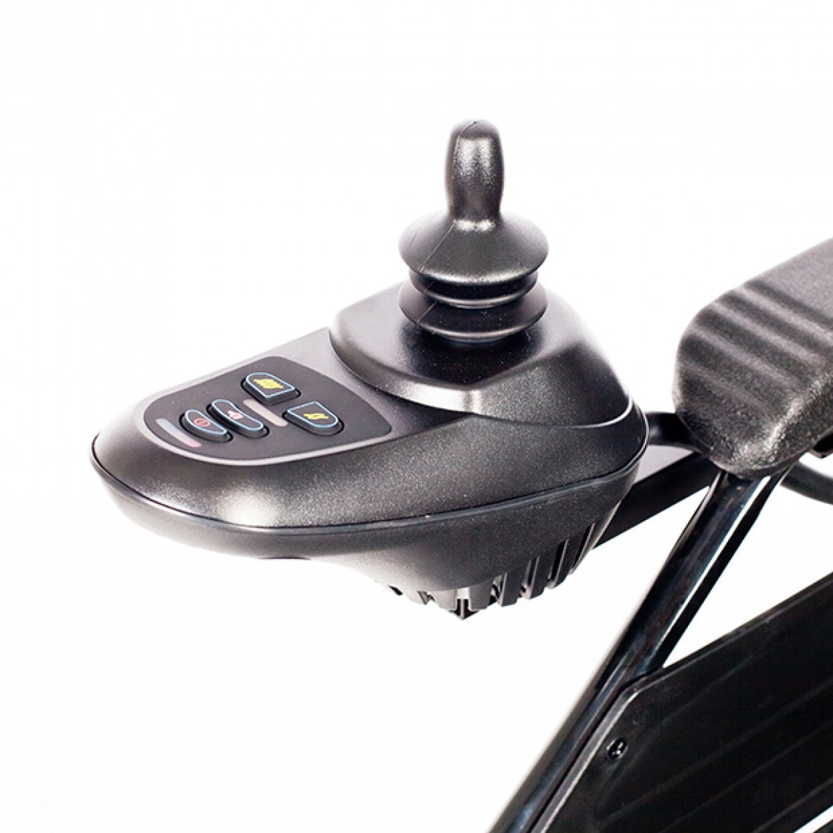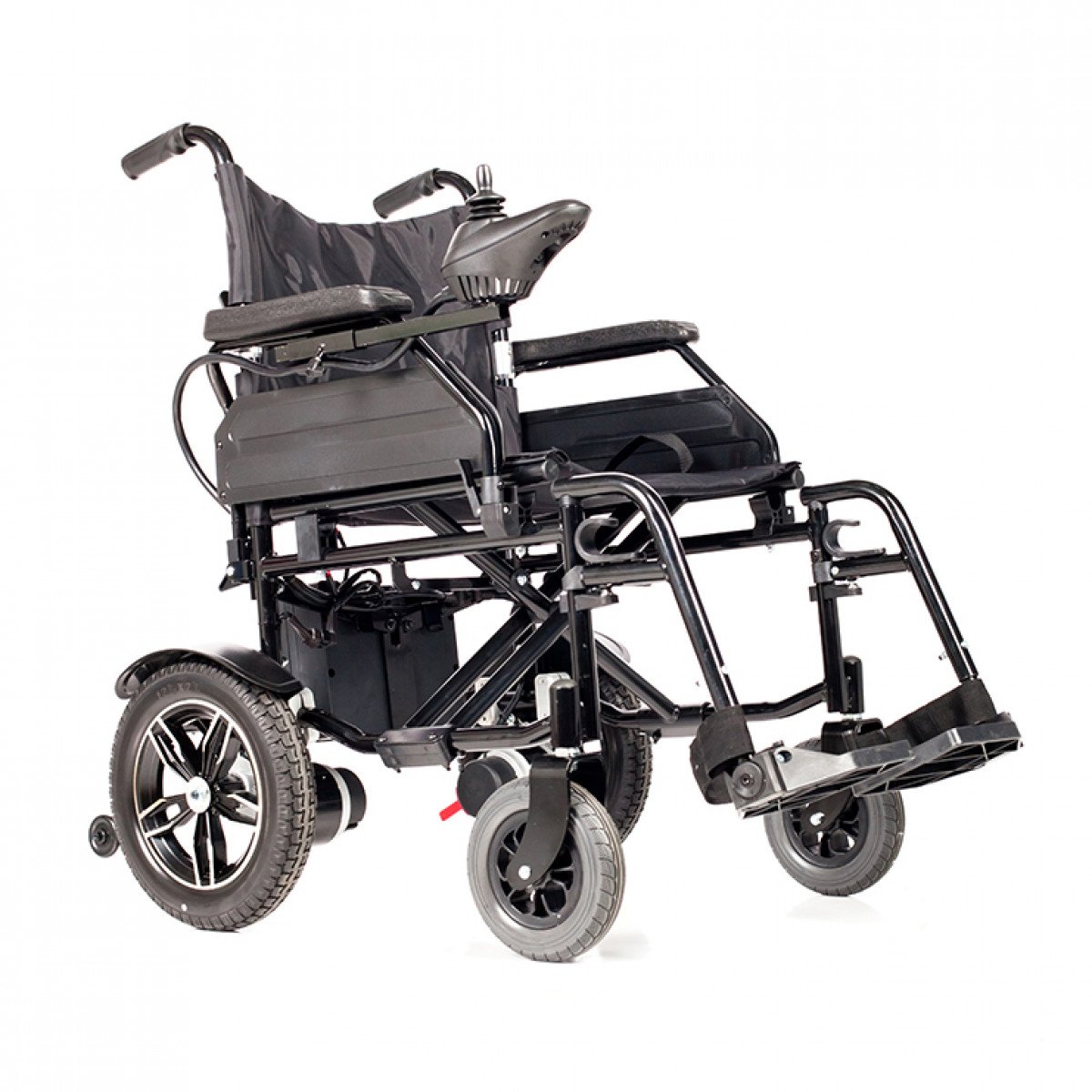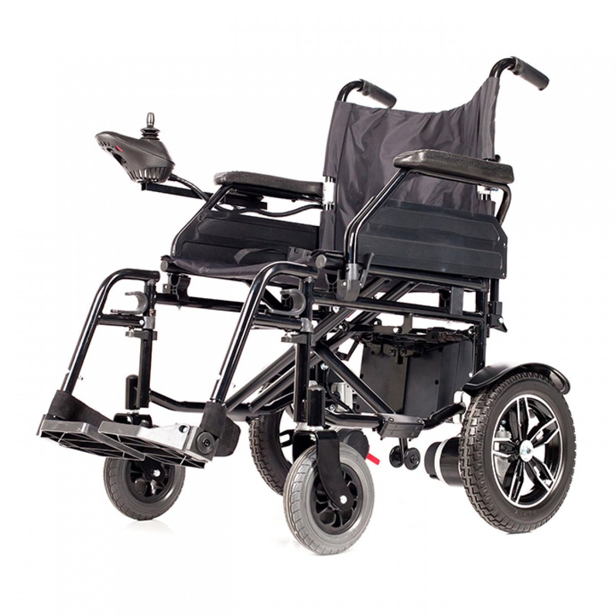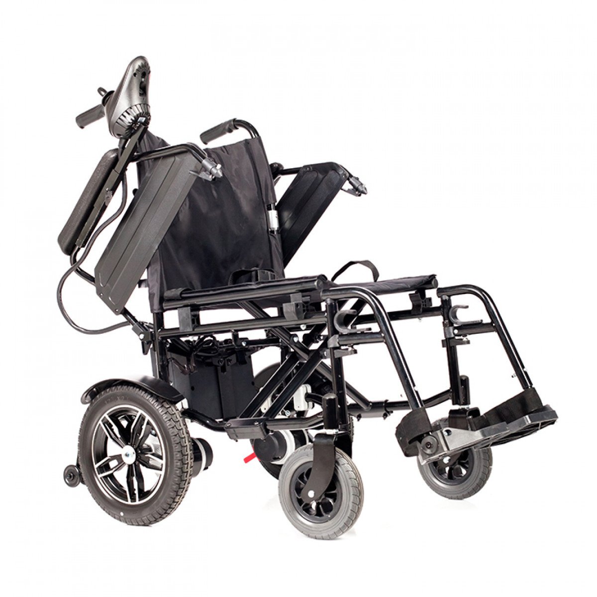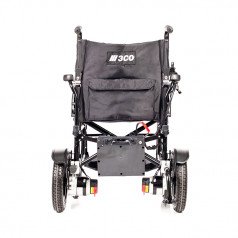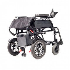 Коляска проста в использовании: пульт управления можно установить с удобной стороны и настроить по вылету, а при отключении электропривода модель легко переводится в режим сопровождения. Подлокотники и подножки — съёмно-откидные, что упрощает пересаживание и настройку под пользователя. Спинка складная, а сиденье выполнено из прочного материала, который не растягивается и легко очищается.