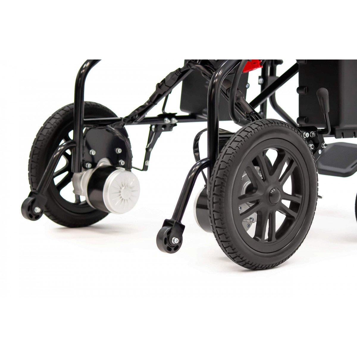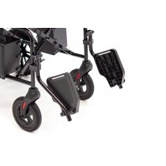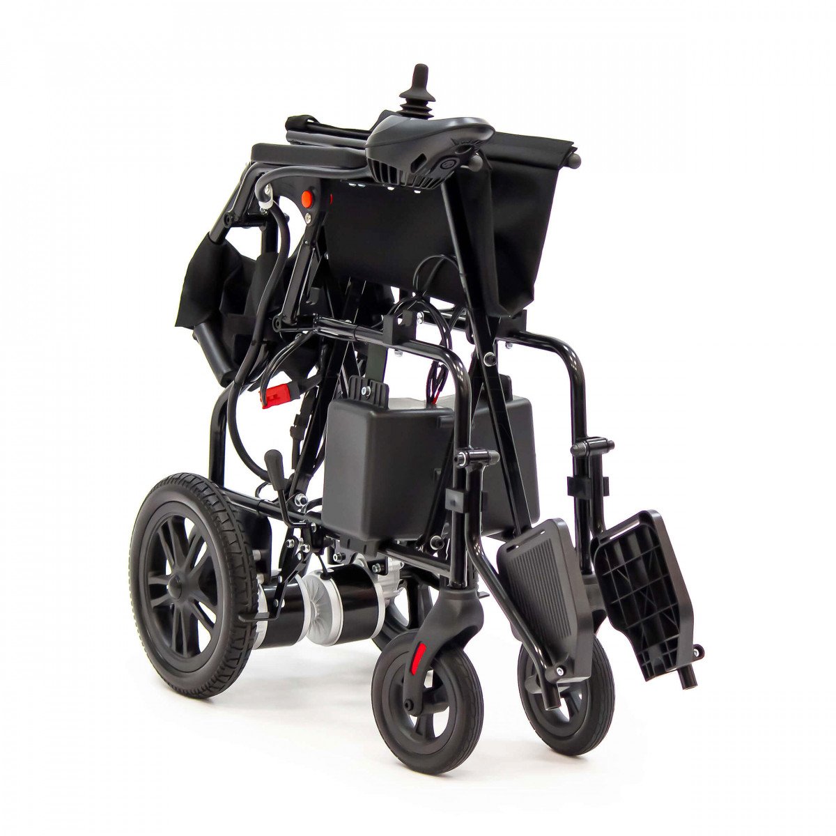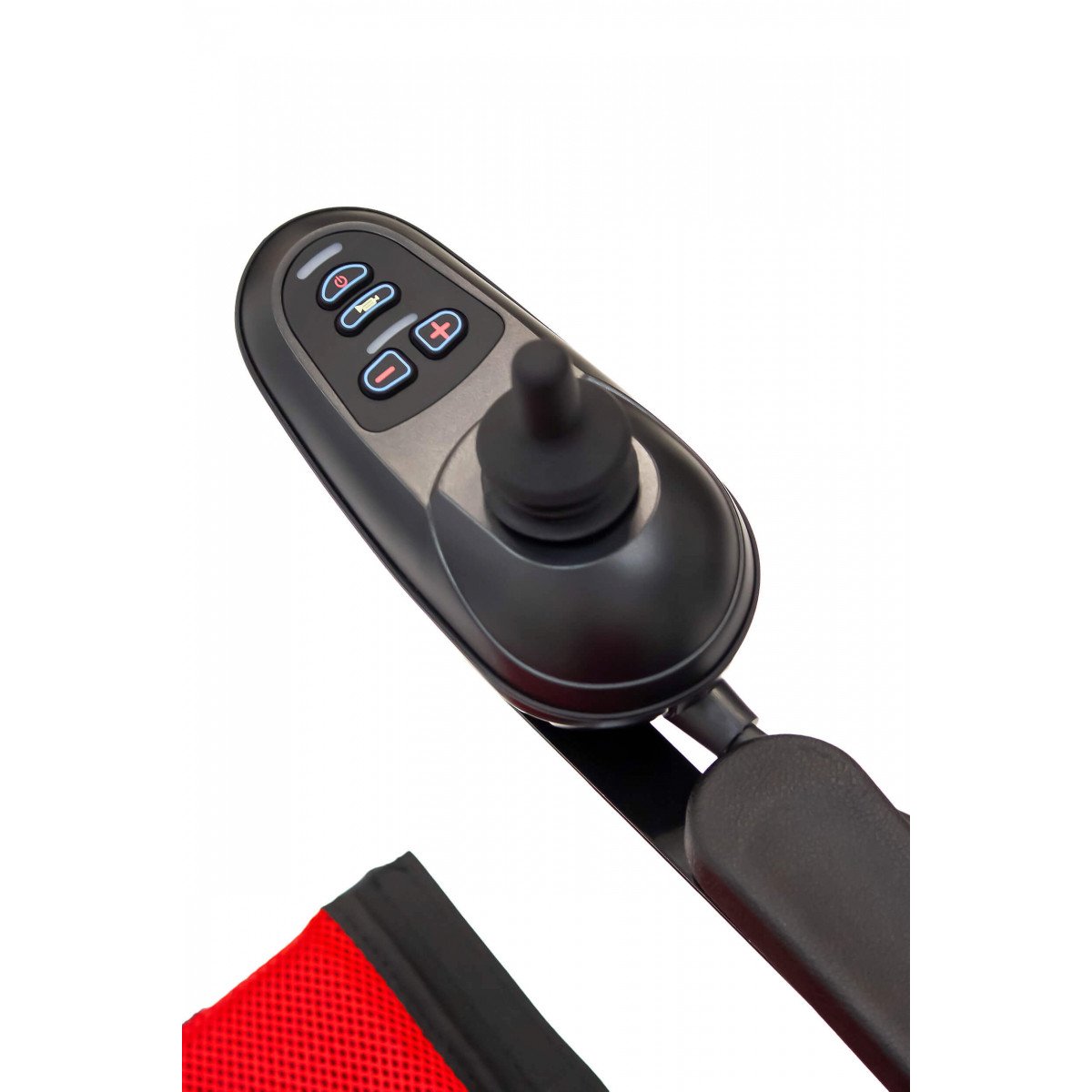 Для устойчивости предусмотрены антиопрокидыватели — они помогают сохранить баланс и повышают безопасность при движении. Контроллер можно установить с правой или левой стороны подлокотника, поэтому пользоваться коляской комфортно независимо от ведущей руки. На панели размещены джойстик, кнопка звукового сигнала, включение питания и регулировка скорости — всё под рукой и без лишних элементов.