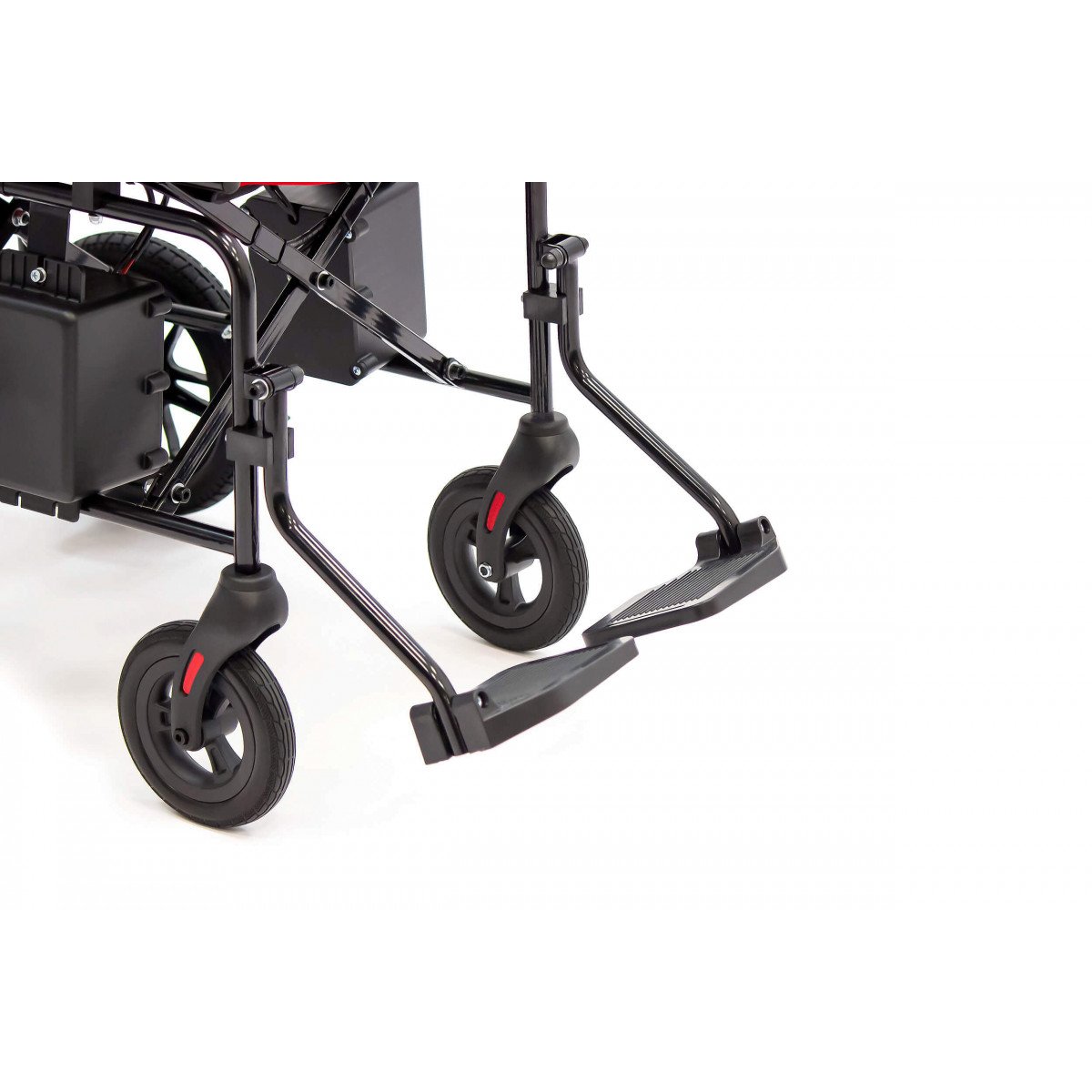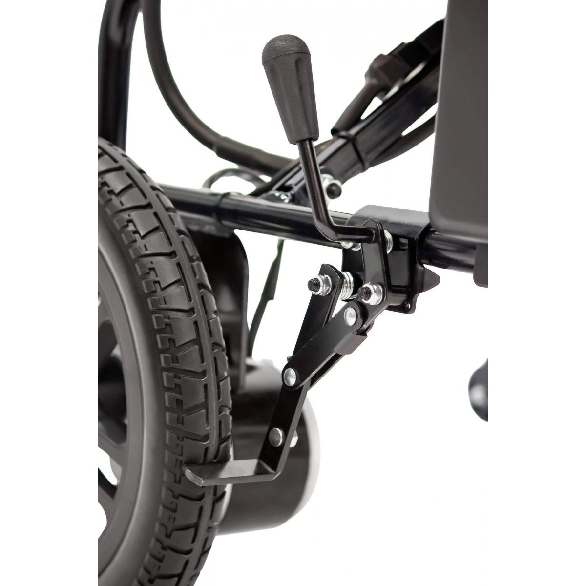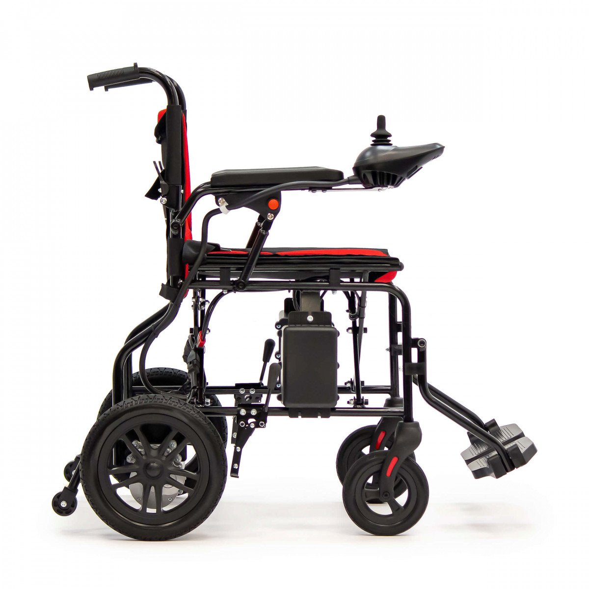 Для устойчивости предусмотрены антиопрокидыватели — они помогают сохранить баланс и повышают безопасность при движении. Контроллер можно установить с правой или левой стороны подлокотника, поэтому пользоваться коляской комфортно независимо от ведущей руки. На панели размещены джойстик, кнопка звукового сигнала, включение питания и регулировка скорости — всё под рукой и без лишних элементов.