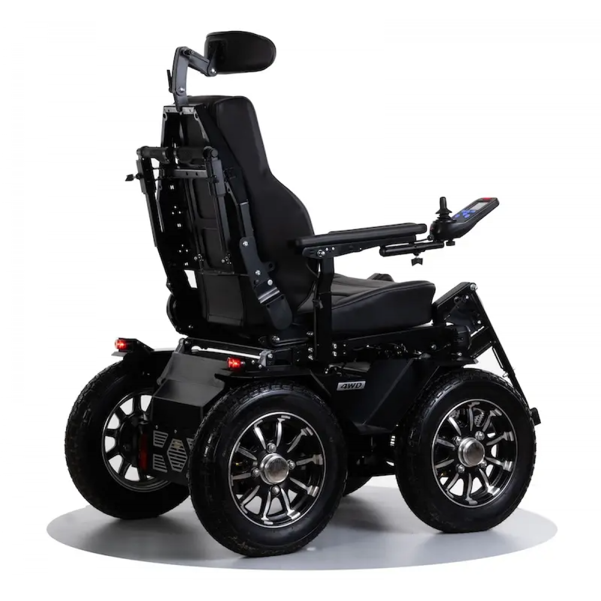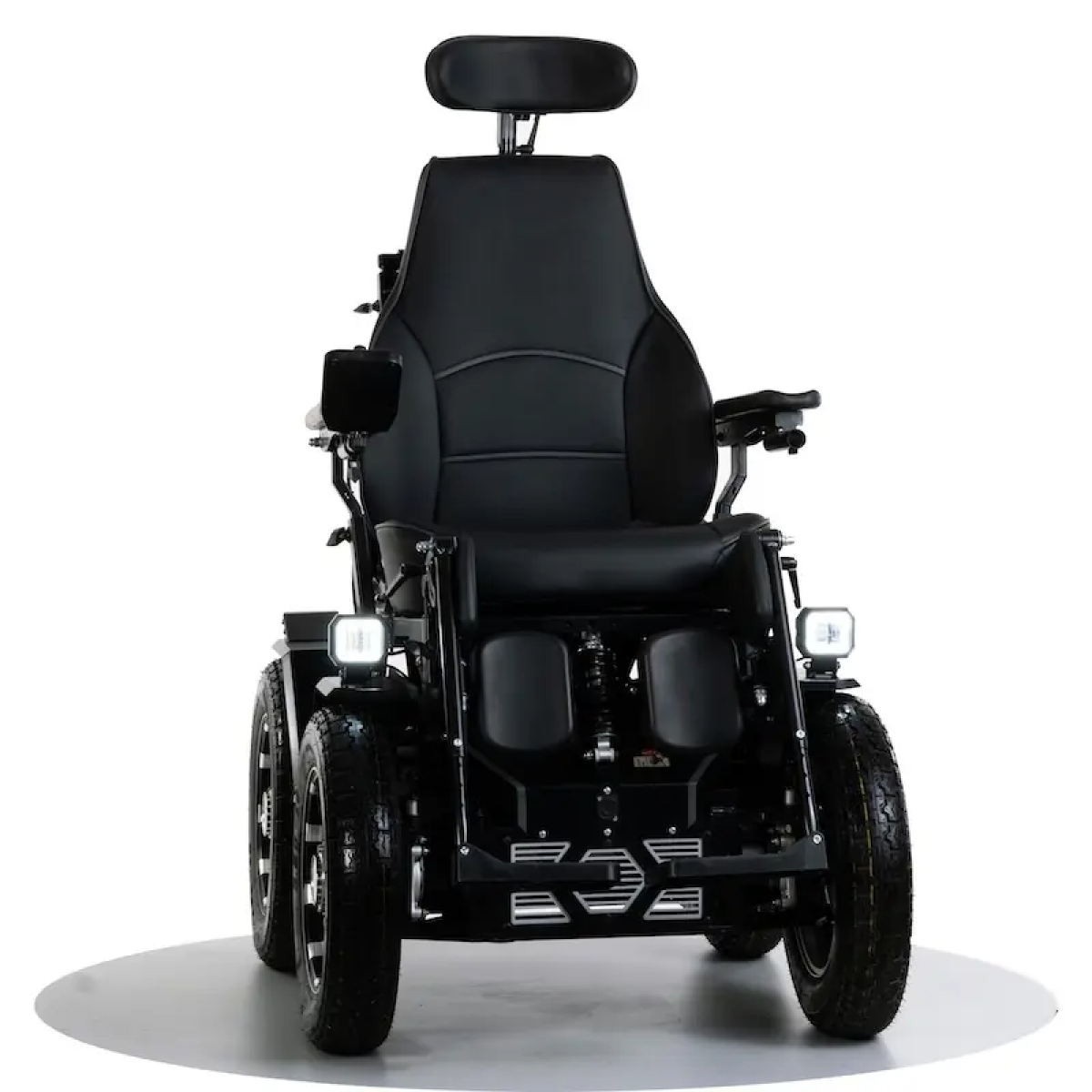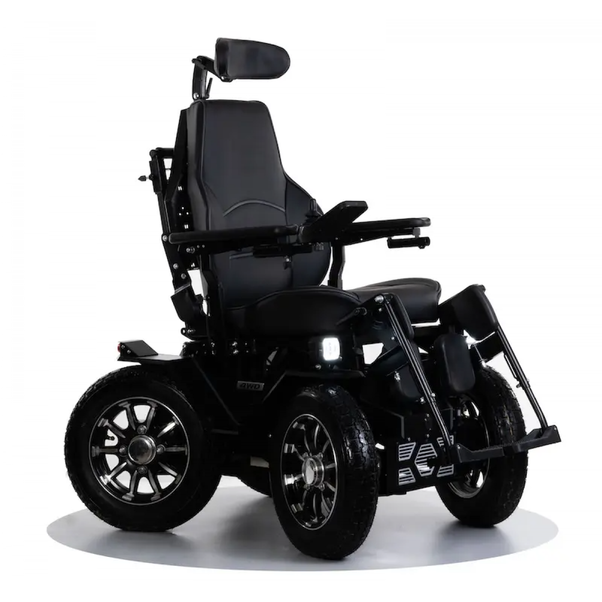 Коляска настраивается под пользователя: регулируется глубина сиденья и высота спинки, подголовник фиксируется в нужном положении. Съёмные элементы позволяют при необходимости установить индивидуальные решения. Дополнительную безопасность обеспечивают электромагнитные тормоза, а для движения в тёмное время предусмотрены светодиодные фары.