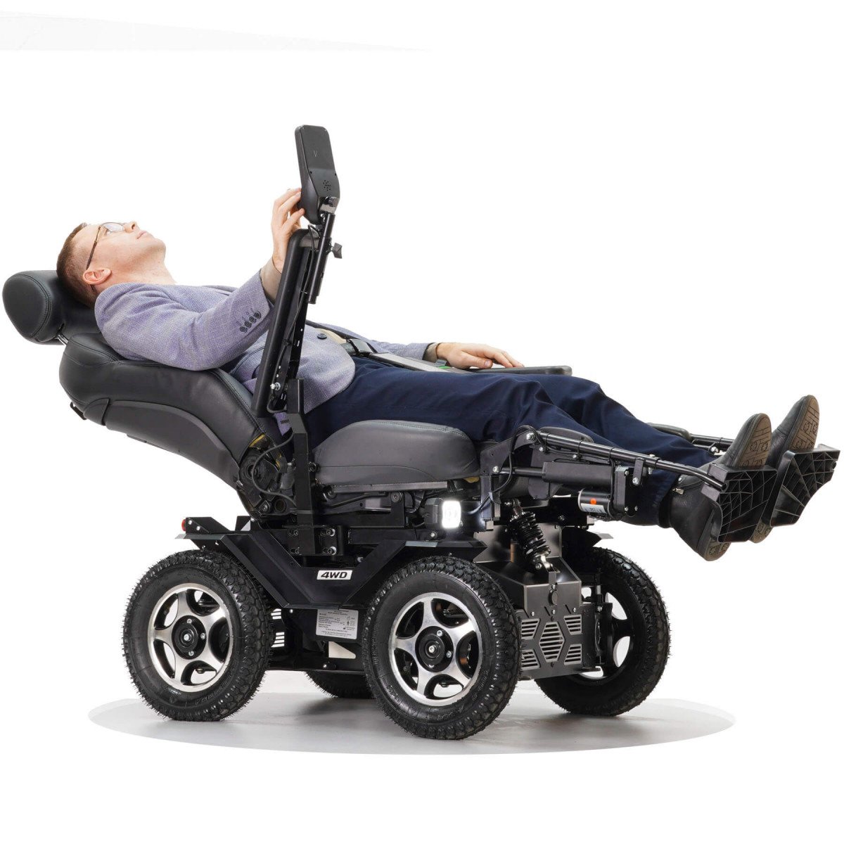 Caterwil Ultra 4WD Lux оснащена четырьмя ведущими электродвигателями, по одному на каждое колесо. Шины большого диаметра с высоким и широким профилем в сочетании с полным приводом обеспечивают феноменальную проходимость по любым поверхностям. Эта коляска уверенно справляется с рыхлым снегом, пляжным песком, топкой грязью, щебнем и другими труднопроходимыми участками.