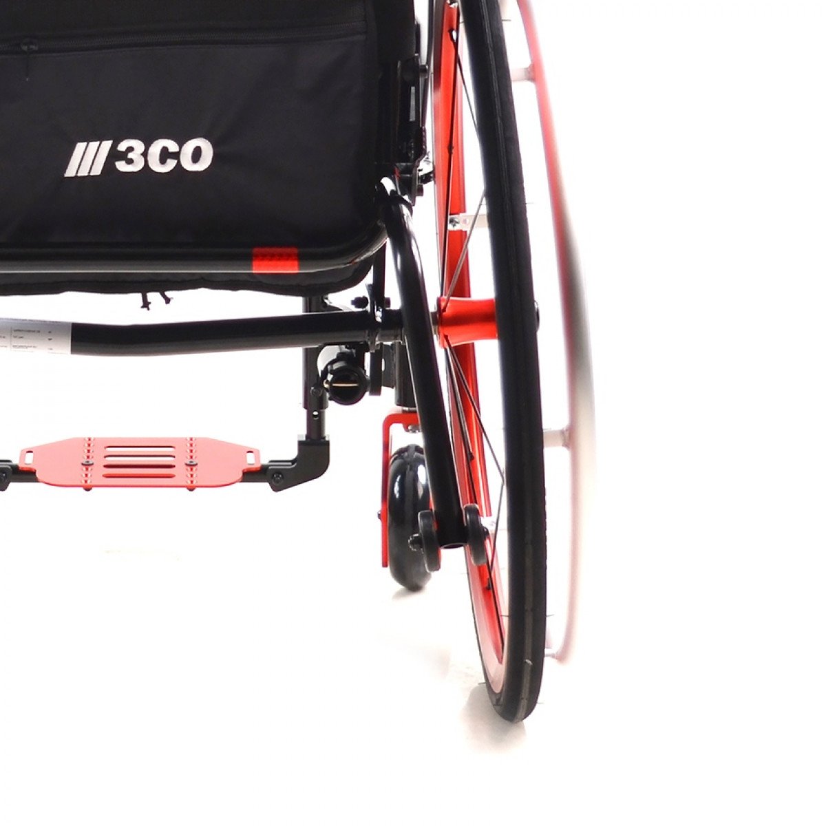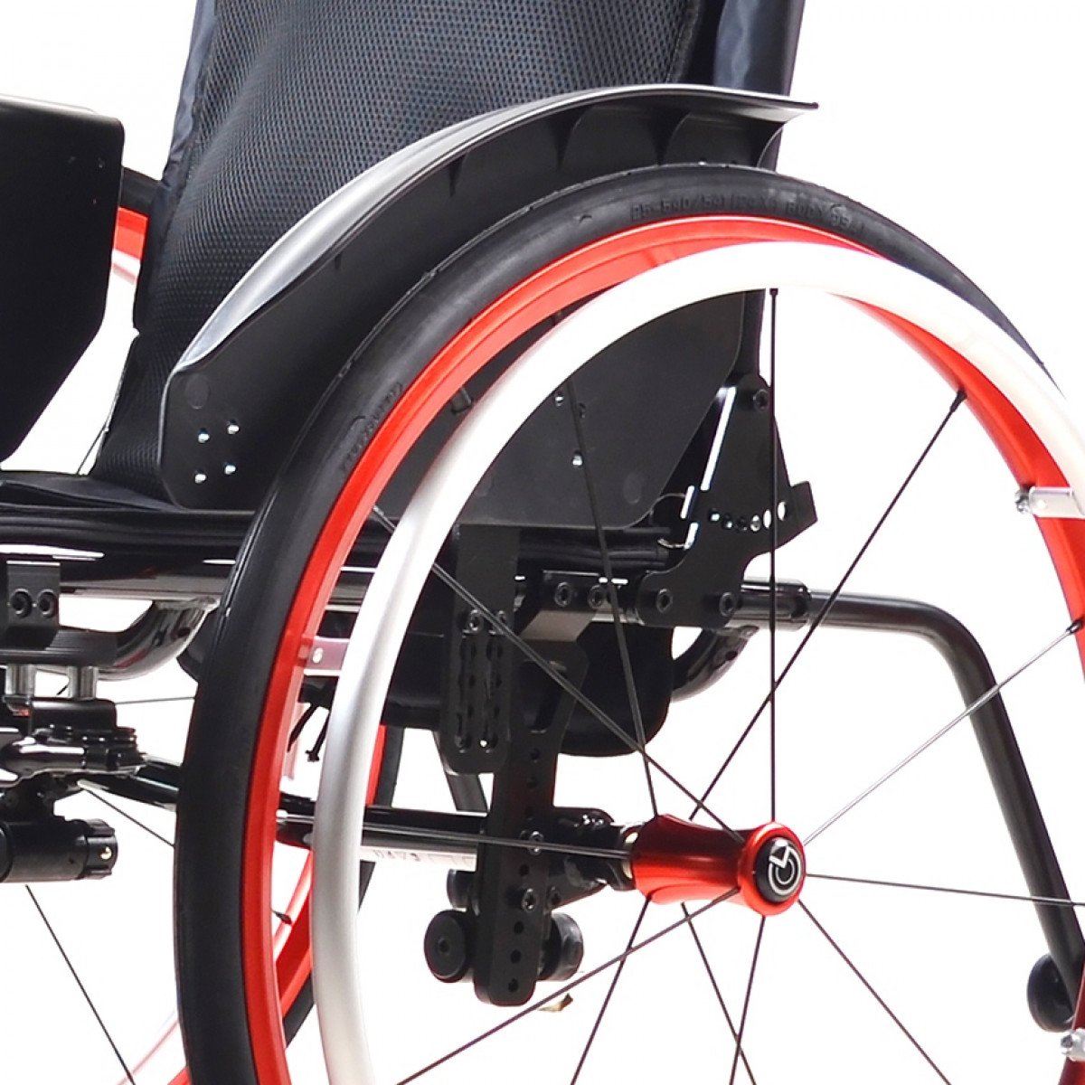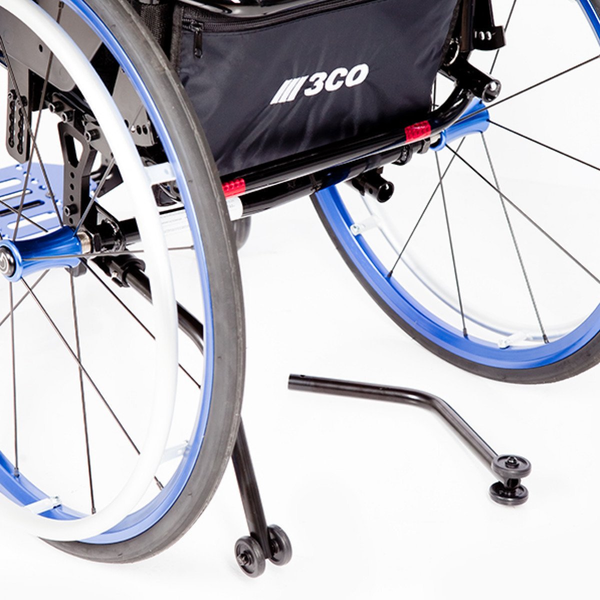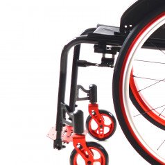 Передние колёса — цельнолитые, задние — быстросъёмные, доступны в вариантах с цельнолитыми или пневматическими шинами. Обода с антискользящим покрытием упрощают управление, а стояночные тормоза с регулировкой обеспечивают контроль при остановке. Для устойчивости предусмотрены антиопрокидыватели, а складные ручки с рельефными накладками делают управление для сопровождающего более удобным.