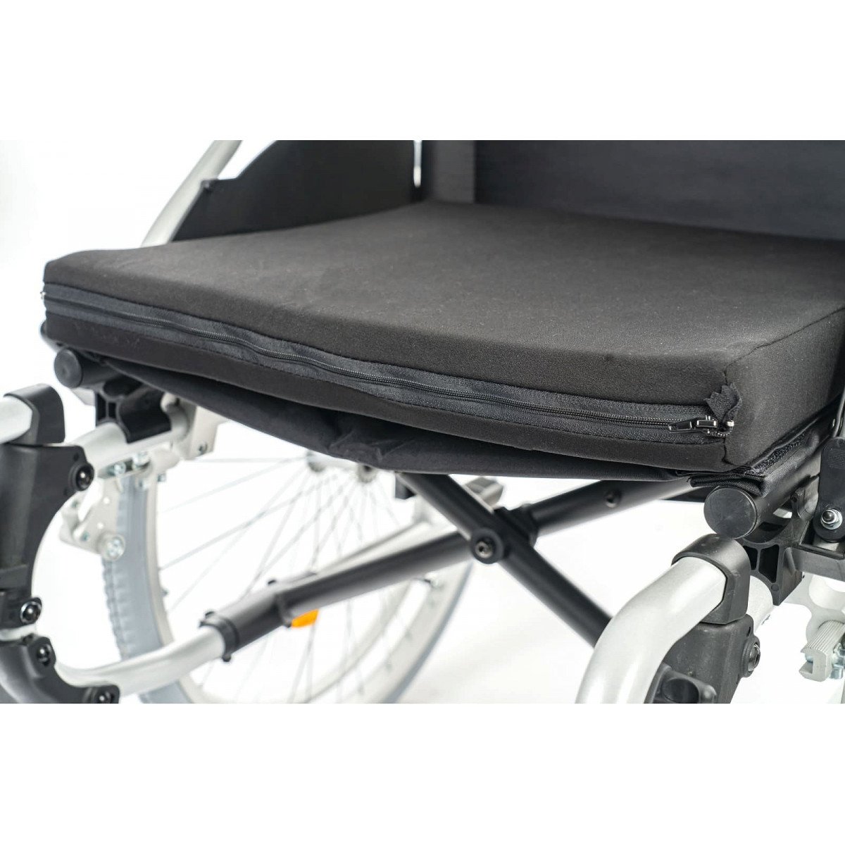 Рама изготовлена из алюминия и складывается по принципу «сторона к стороне» с помощью Х-образного механизма. Такая конструкция снижает вес коляски и облегчает её транспортировку и хранение. Сиденье выполнено из прочного нейлона с водоотталкивающими свойствами и дополнено противопролежневой подушкой со съёмным чехлом.