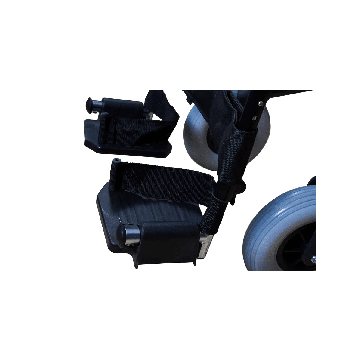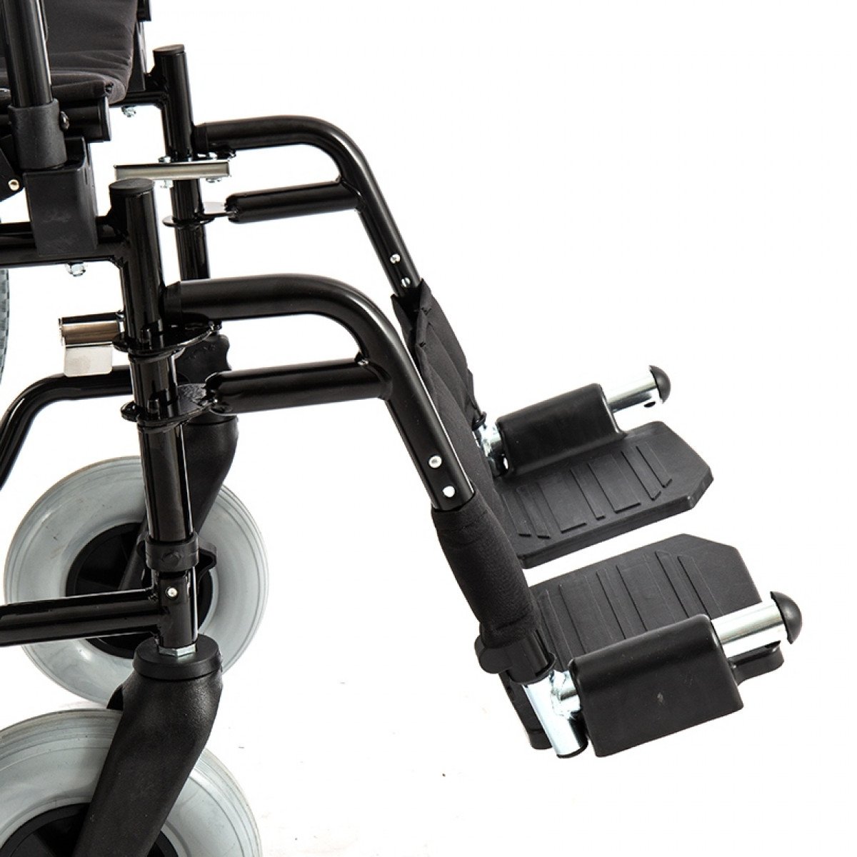 Рама выполнена из стальных труб с антикоррозийным покрытием — это про прочность и долгий срок службы. Коляска складывается без инструментов, а складная спинка помогает уменьшить габариты при хранении. Доступны варианты колёс: цельнолитые или пневматические — под разные условия использования. Для устойчивости предусмотрен антиопрокидыватель с резиновым наконечником, который делает передвижение безопаснее.