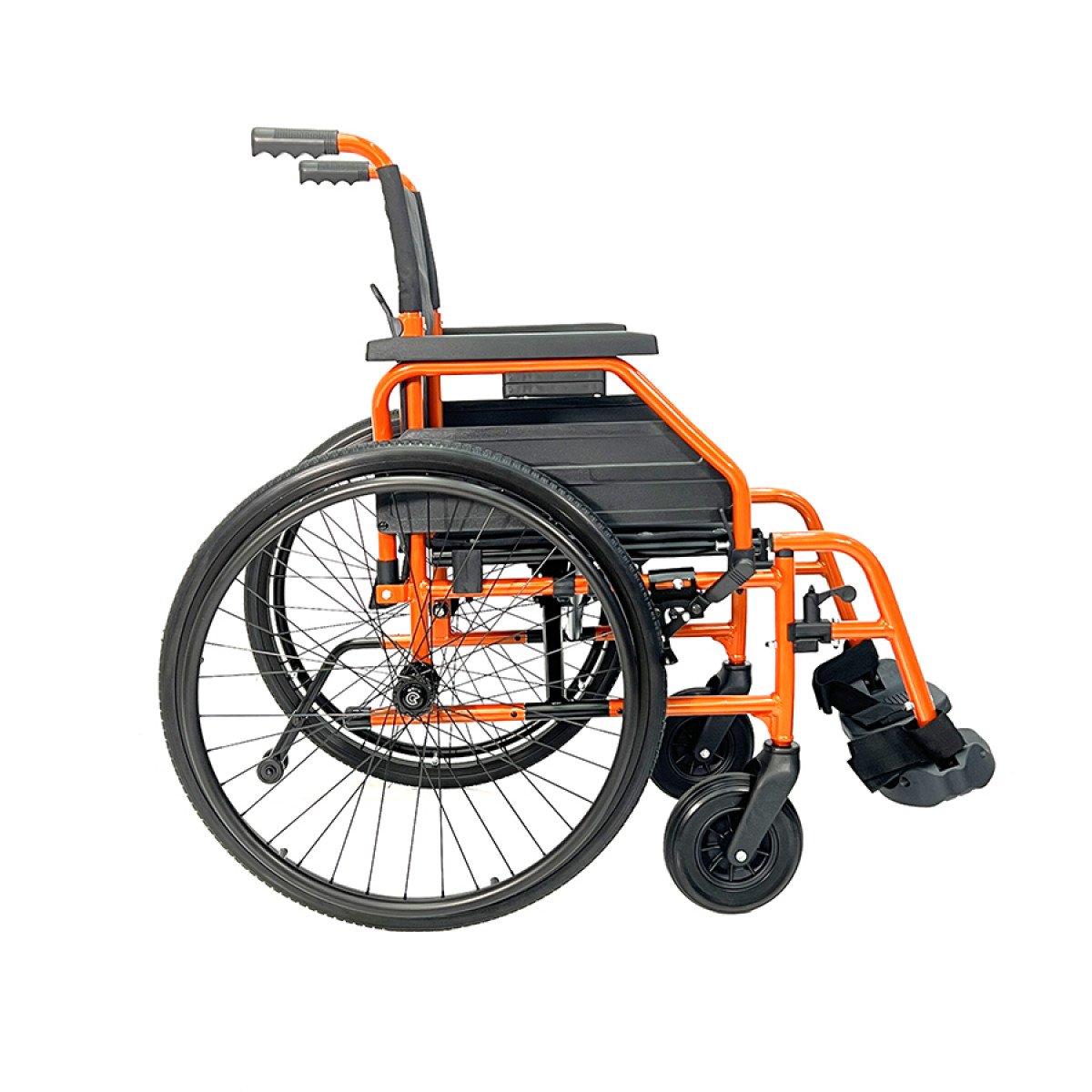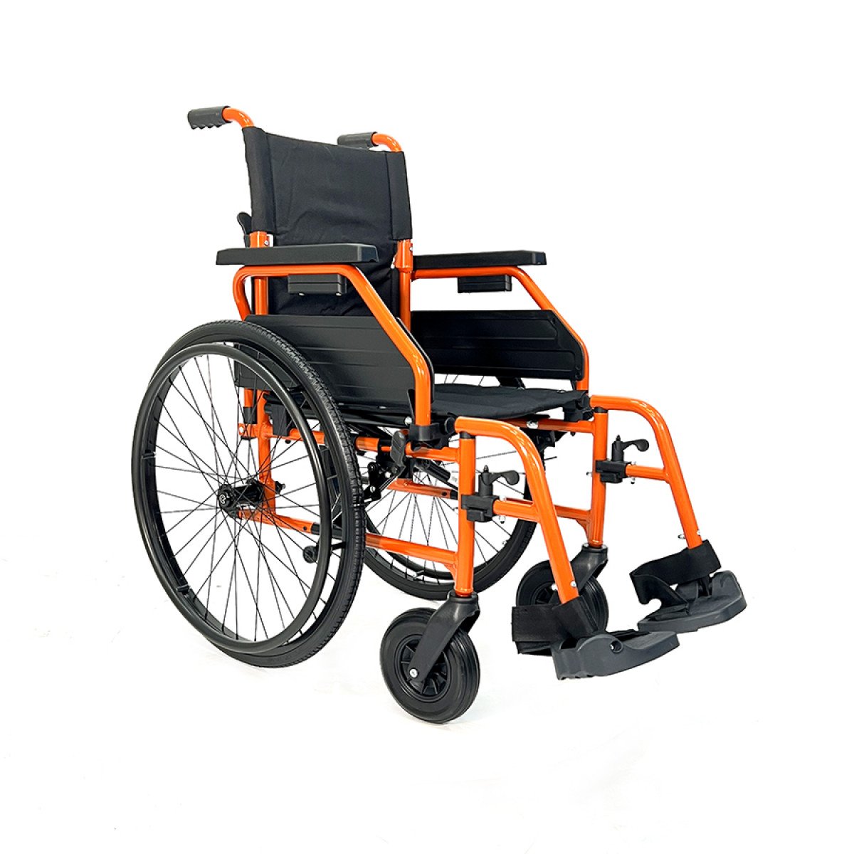 Рама выполнена из стальных труб с антикоррозийным покрытием — это про прочность и долговечность. Коляска складывается без инструментов, спинка также складная, что упрощает хранение и перевозку. Подлокотники откидываются и регулируются по высоте с помощью проставок, облегчая пересаживание и позволяя настроить удобную посадку. Подножки — съёмно-откидные, с регулировкой угла наклона, а ложементы под голени настраиваются по высоте для более правильного положения ног.