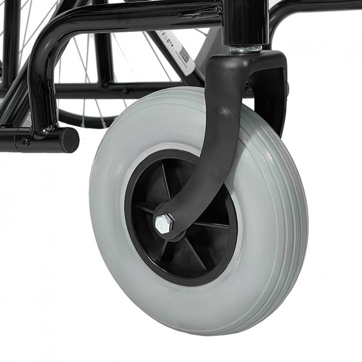 Коляска выполнена на прочной стальной раме, что даёт надёжность при регулярной эксплуатации. Регулируемые элементы помогают подобрать удобное положение корпуса и снизить нагрузку при длительном сидении. Цельнолитые колёса не требуют обслуживания и обеспечивают устойчивость на разных покрытиях.