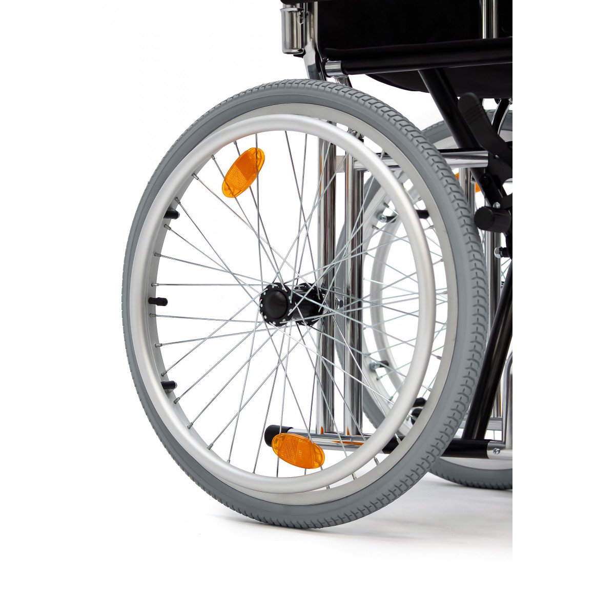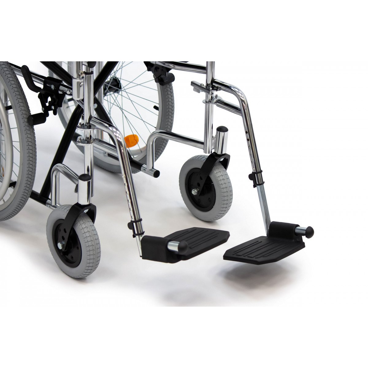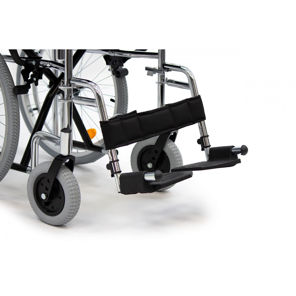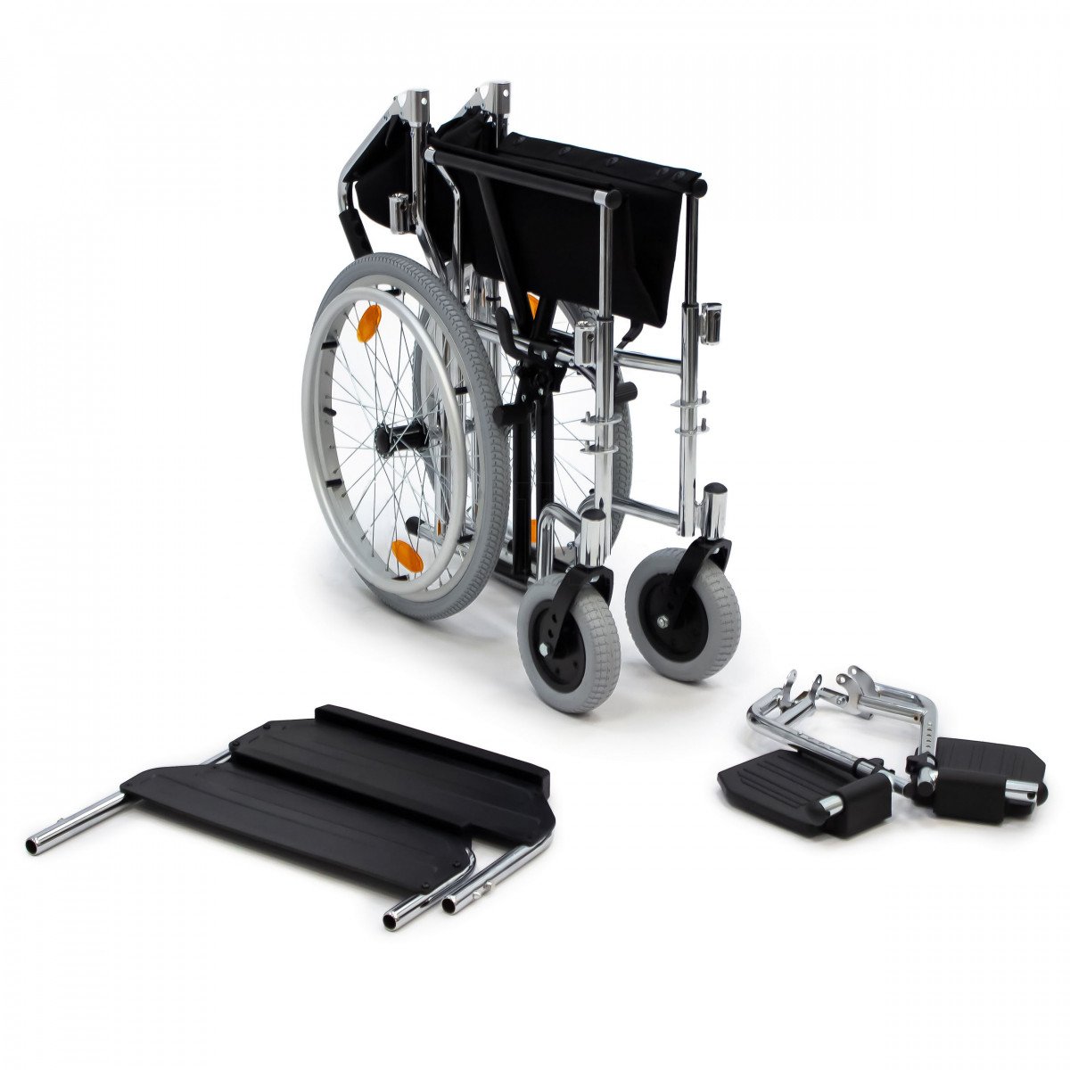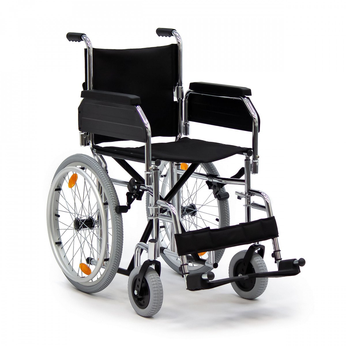 Модель подходит как для самостоятельного использования, так и для передвижения с сопровождающим. Скошенные подлокотники позволяют подъехать вплотную к столу и занять удобное положение. Коляска складывается вместе со спинкой, поэтому её удобно хранить дома и перевозить в автомобиле.