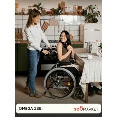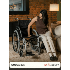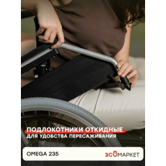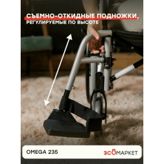 Omega 235 легко настраивается: приводные колёса регулируются по положению, подлокотники можно отрегулировать по высоте или снять для удобного пересаживания. Передние колёса также регулируются по высоте, что помогает точнее подстроить посадку. Подножки — съёмные, откидные, с регулировкой, упрощают посадку и делают коляску компактнее при перевозке.