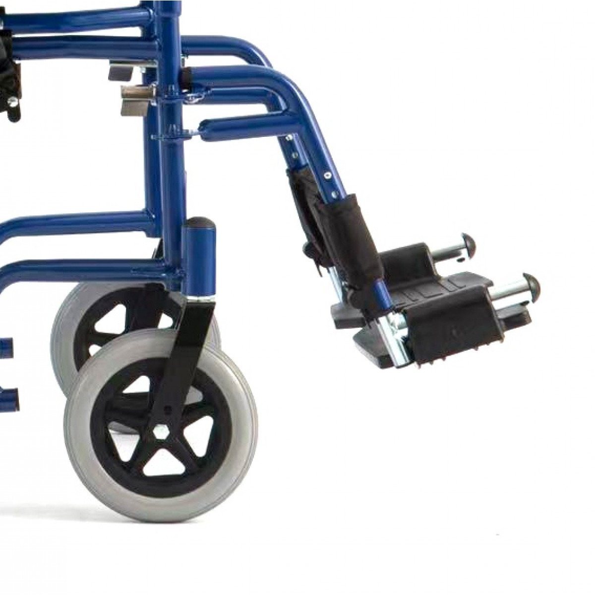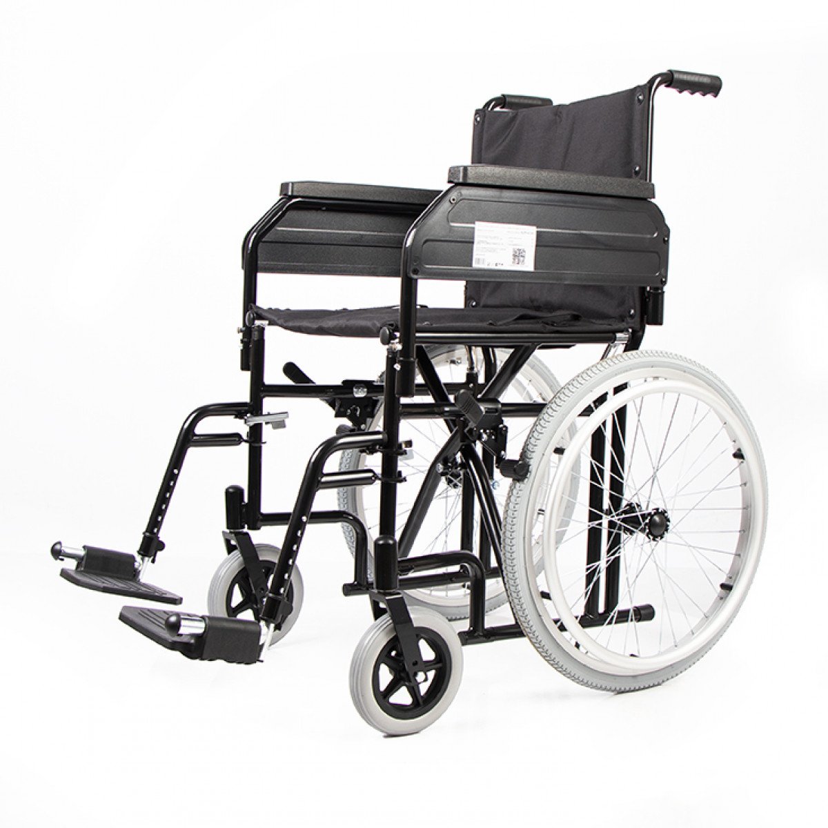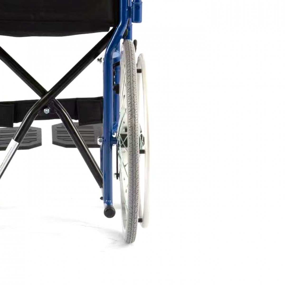 Передние и задние колёса доступны в вариантах: цельнолитые или пневматические — под разные условия эксплуатации. Задние колёса быстросъёмные, что облегчает перевозку. Подножки регулируются по высоте, откидываются или снимаются, а раздельные опоры для стоп помогают правильно разместить ноги и повысить комфорт при длительном использовании.