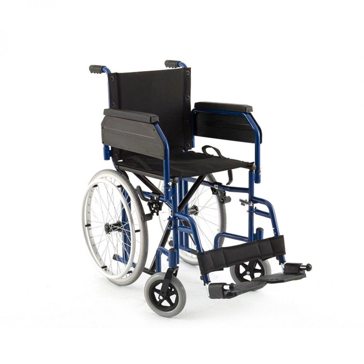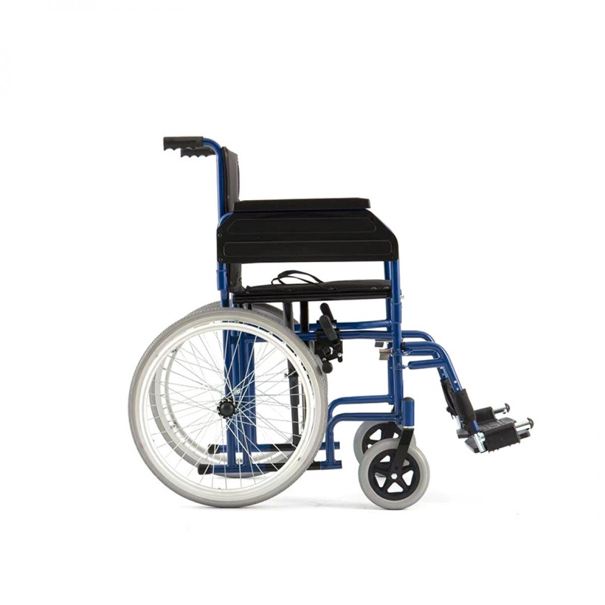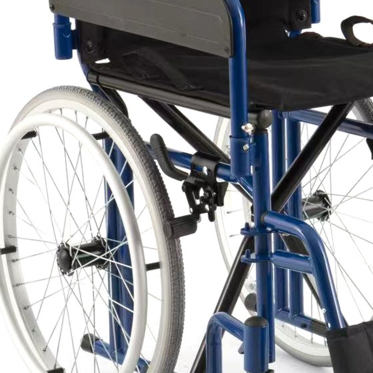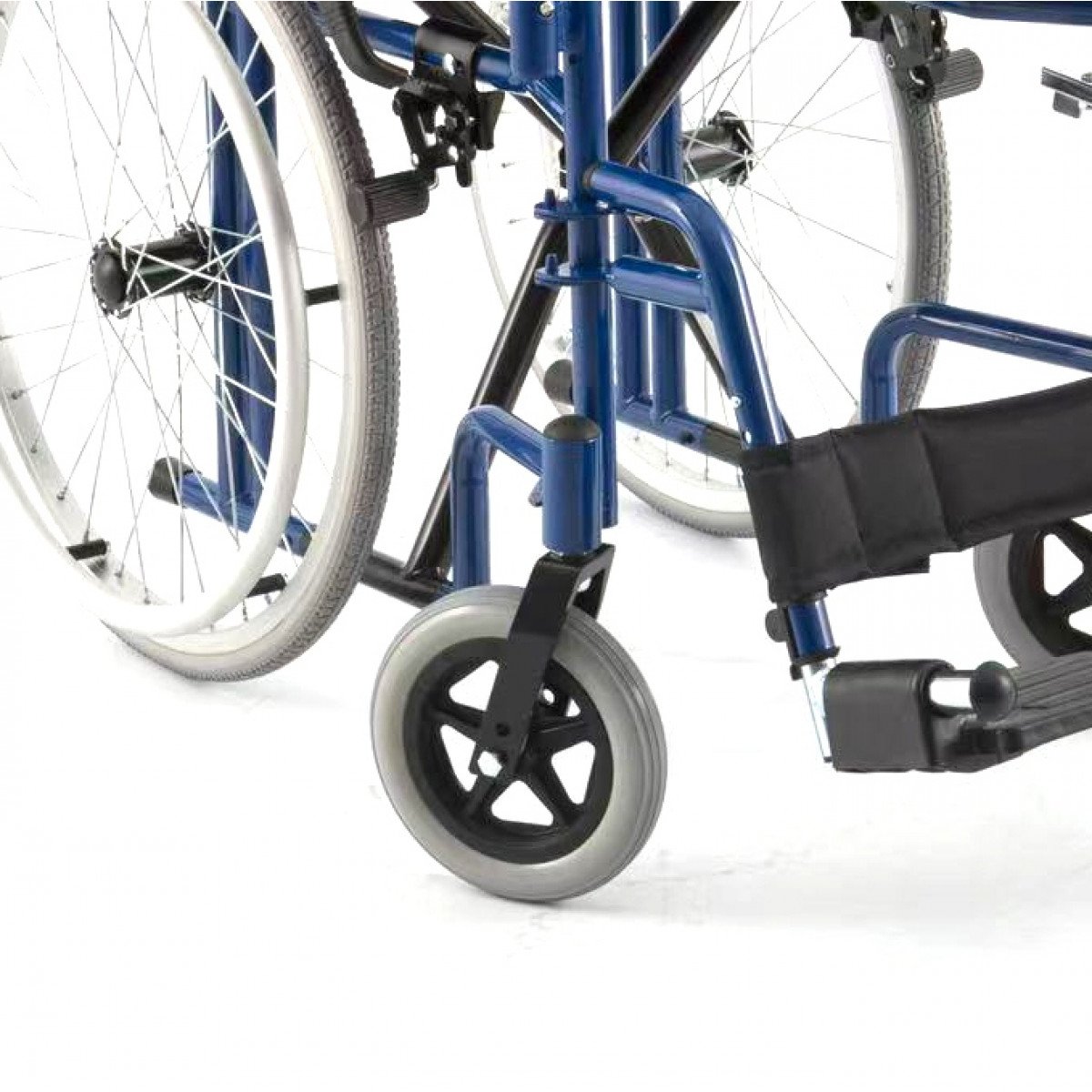 Передние и задние колёса доступны в вариантах: цельнолитые или пневматические — под разные условия эксплуатации. Задние колёса быстросъёмные, что облегчает перевозку. Подножки регулируются по высоте, откидываются или снимаются, а раздельные опоры для стоп помогают правильно разместить ноги и повысить комфорт при длительном использовании.