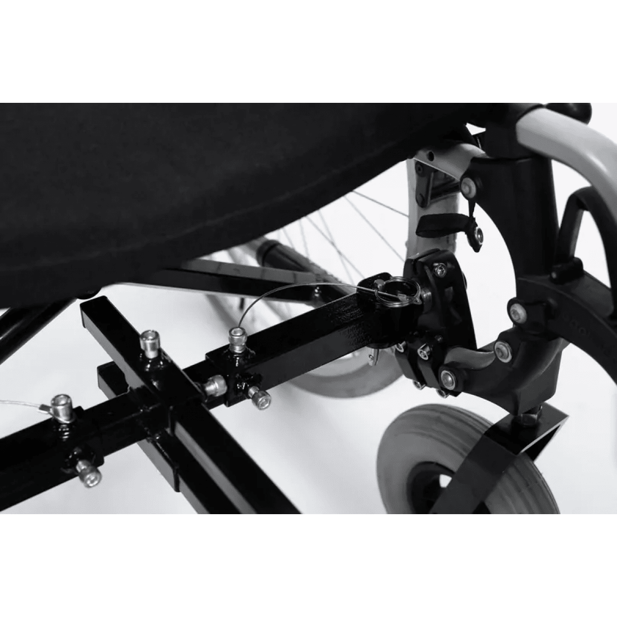 Задний ход в конструкции не предусмотрен: для движения назад достаточно удерживать руль одной рукой, а другой прокручивать обод колеса коляски. Управление интуитивное, руль складной и регулируется по высоте, что упрощает хранение и транспортировку.