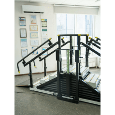 - Два вида тренировок: ходьба по горизонтальной поверхности с опорой на брусья и подъём по лестнице